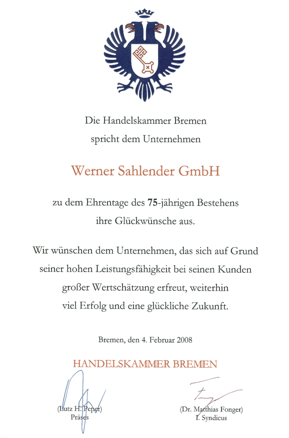 Werner Sahlender GmbH | Haferwende 37 | 28357 Bremen | Tel.: +49 (0)421 340166 | Fax: +49 (0)421 3401677 | E-Mail: office@wsahlender.de